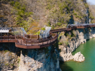 단양 1박 2일 여행코스 추천 세 번째! 만천하스카이워크의 만학천봉전망대는 원형으로 만들어져 소백산과 금수산, 월악산 등 백두대간 명산들을 동서남북 사면으로 감상할 수 있고, 남한강 수면 위 80m 높이에 전망대 맞은편 남한강을 향해 삼지창 모양으로 삐져나와 있는 하늘길에 올라서면 남한강의 절경이 한눈에 들어오며 구름 위를 걷는 듯한 아찔함을 경험할 수 있다.