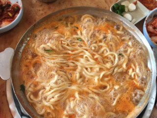 공주 맛집 베스트 10 추천 리스트 여섯 번째! 대표 메뉴인 칼국수는 테이블 위에서 바지락과 된장, 채소를 넣은 육수를 끓이다가 칼국수 면을 넣어서 즉석에서 조리해 먹는다. 취향에 따라 매콤한 양념을 더해서 칼칼하게 즐길 수도 있다.