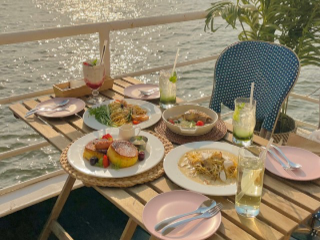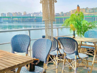 압구정 카페 추천 네 번째! 살롱드애일리는 잠원 한강 공원에 있는 선상 레스토랑 겸 브런치 카페이다. 테라스 좌석으로 나가면 가슴이 뻥 뚫리는 한강 뷰가 펼쳐진다. 흰색 햇빛 가림막과 소파, 라탄 조명, 곳곳의 식물들이 어우러진 테라스가 이국적인 분위기를 물씬 자아낸다. 대표 메뉴는 두툼한 빵에 계란 물을 입혀 폭신하게 구운 프렌치토스트와 소시지가 함께 나오는 애일리 프렌치토스트이다.