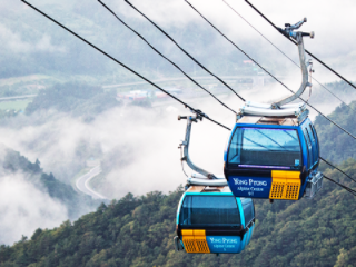 평창 1박 2일 여행코스 두 번째! 안정성과 속도감이 뒤어난 100대의 8인승 케빈이 이어진 왕복 7.4Km 국내 최대 길이의 용평 발왕산 관광 케이블카는 드래곤 프라자 탑승장에서 출발하여 우리나라에서 12번째로 높은 해발 1,458m(1,458미터) 발왕산 정상의 드래곤피크 하차장에 이르는 18분 동안, 하늘을 날아오르는 듯한 유유한 멋과 싱그러운 자연의 정취에 흠뻑 빠져들게 할 것이다.