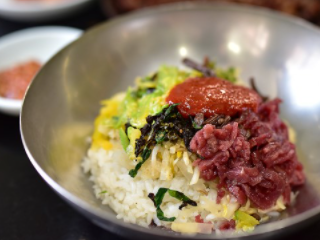 진주 맛집 추천 리스트 여섯 번째! 진주에 위치한 비빔밥과 석쇠 불고기 전문점이다. 메뉴로 국내산 한우가 들어간 비빔밥, 불고기, 육회가 있다. 비빔밥 주문 시 콩나물과 무가 들어간 매콤한 선짓국이 함께 제공되며 불고기는 조리되어 접시에 담겨 나온다.