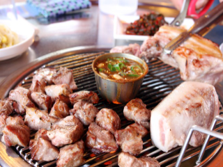 제주도 중문 맛집 추천 현지인 베스트 일곱 번째! 제주중문단지에서 흑돼지를 제대로 맛볼 수 있는 30년 넘게 이어져 온 곳입니다. 참숯만을 이용하여 고기를 구우며 불판 위에 은박 접시를 하나 올려 콩나물 무침이나 김치 등을 구워서 함께 먹습니다. 주문 시 나오는 자리돔젓갈소스는 독특하면서 고소하고 깊은 맛을 냅니다.