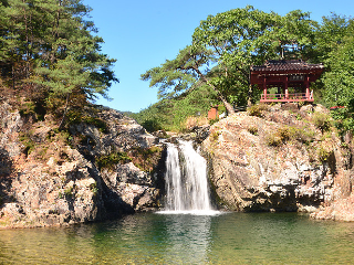 상주 1박 2일 여행코스 추천 세 번째! 천황봉에서 길게 뻗어 내려온 산과 물이 한 용소로 깊숙이 떨어지니 이것이 바로 장각동구의 장각폭포다. 폭포의 높이는 6m가 넘으며 수량이 많아 산천을 진동하고 수십 장 애안 아래 검푸른 용소는 그 깊이를 헤아릴 수 없으며 낙수의 여파로 빙글빙글 돌고있는 수면을 보고 있으면 금방 용이라도 치솟아 오를 것 같은 느낌을 준다.