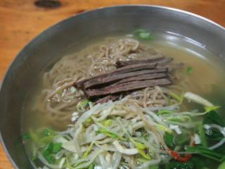 의령 맛집 추천 현지인 베스트 두 번째! 메밀면에 소고기 육수와 멸치 다시 육수를 섞어 국물을 내고, 장조림 양념의 사태 고기를 고명으로 올린 것이 특징입니다. 온소바와 냉소바, 초고추장 양념의 비빔 소바가 준비되어 있습니다.