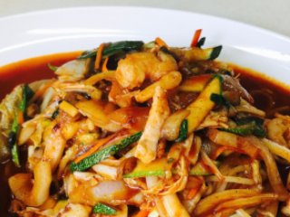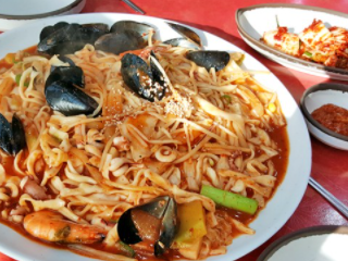 칠곡 맛집 추천 베스트 세 번째! 기와지붕의 소박한 식당으로 이색적인 해물볶음국수를 맛볼 수 있습니다. 홍합, 오징어를 듬뿍 넣고 전분으로 걸죽한 국물을 낸 볶음국수는 넙적한 접시에 담아내어 쟁반짬뽕을 연상시킵니다. 고추장 느낌의 매운맛에 칼국수면이 어우러져 특유의 맛을 내기 때문에 별미로 알려져, 인기 메뉴입니다.