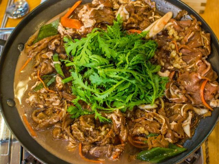청도 맛집 추천 베스트 세 번째! 금천 한우를 전문으로 하는 고깃집입니다. 두툼하게 썰어서 내는 주먹시(토시살) 고기가 유명합니다. 한우불고기는 커다란 냄비에 육수를 붓고 당면과 채소, 버섯 등을 넣어 푸짐하게 끓여내는 스타일입니다. 집에서 먹는 듯한 반찬이 열 가지 정도 깔리는데, 직접 농사를 지어 만든 것들이 많습니다. 시골 손맛을 느끼게 하는 시래기 된장국의 맛도 일품입니다.
